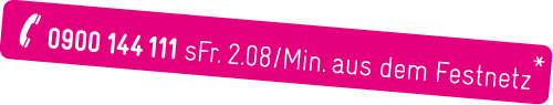 * gebührenpflichtig, sFr. 2.08/Min. aus dem Festnetz. Per Natel easy in Spezialfällen nicht erreichbar (unter 16 Jahren, gesperrte 0900-Nummer)